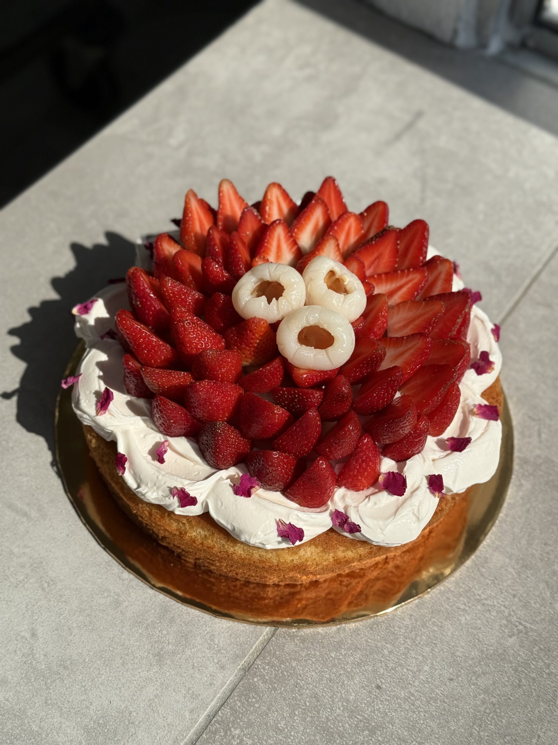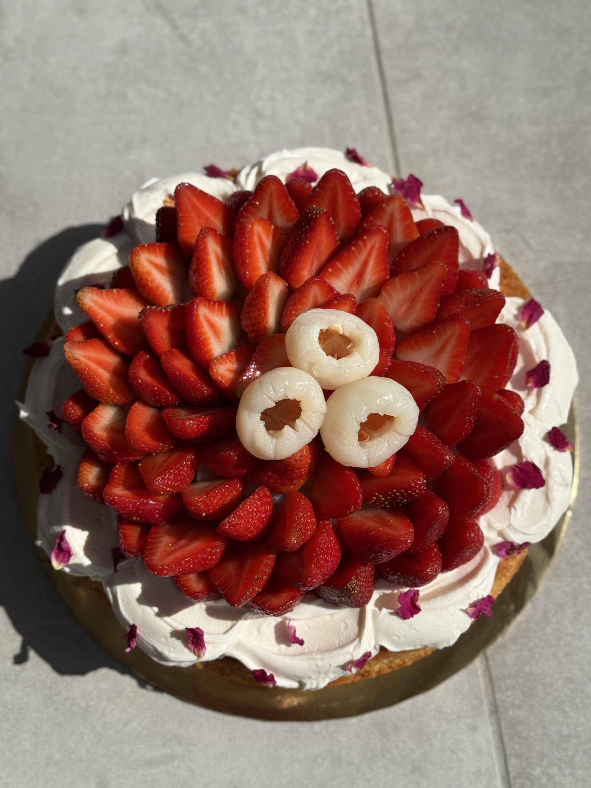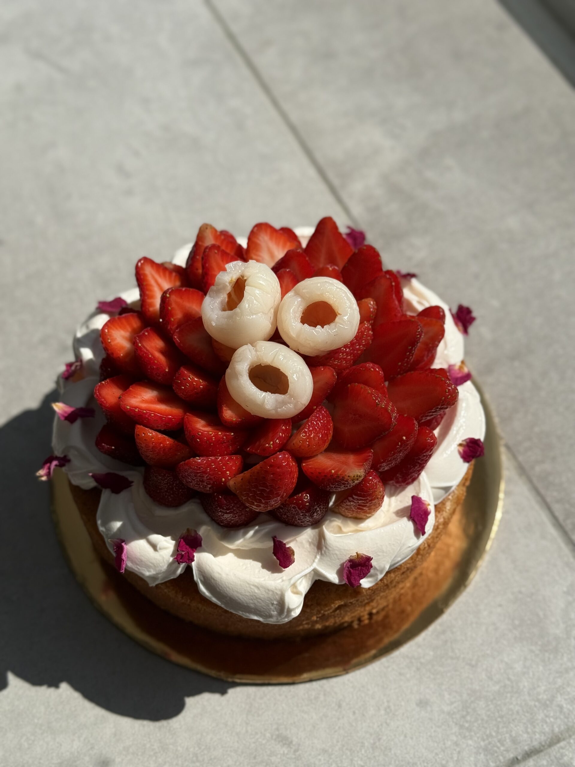 This is a gussied-up butter cake, dressed to the nines! It is our salted butter & almond cake, topped with some lightly rose-scented mascarpone, and lots of strawberries and lychees. This is a good option for those who don’t want anything too adventurous beyond an old-school butter cake, but want it fancied up for a celebration.
